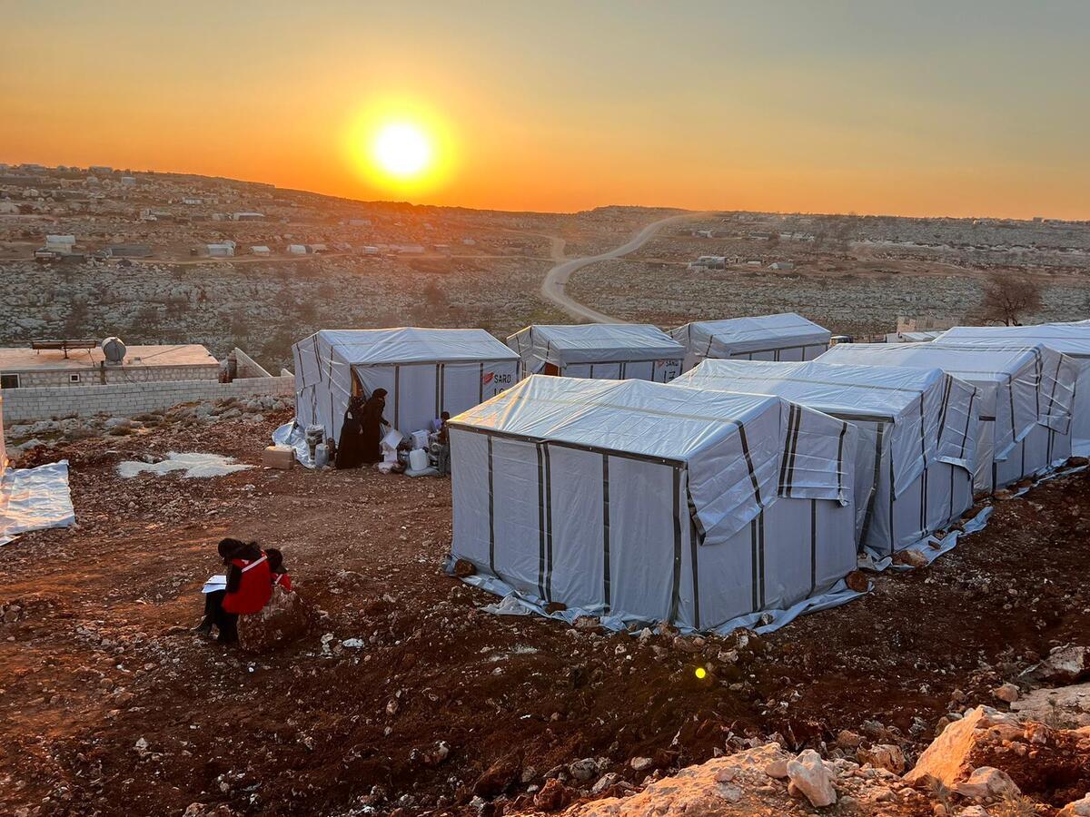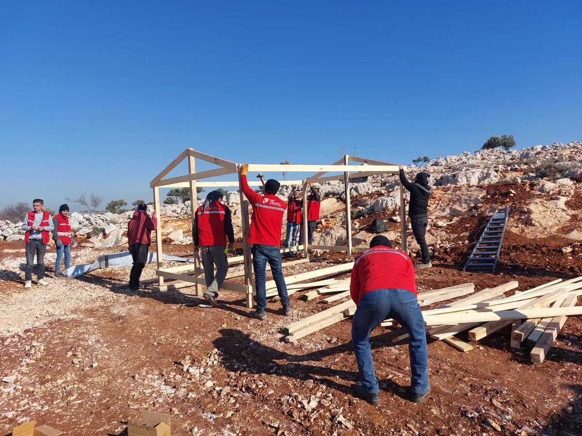 Setting up tents for the most affected by the earthquake in Hezrah, Syria